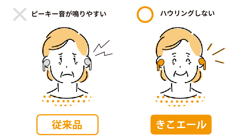 集音器を購入したのに、「ピーキー音(ハウリング音)がうるさくて」とすぐに使用をやめてしまったという方が少なくありません。初めて集音器を選ぶ場合、ハウリングの有無をチェックする人は少ないですが、重要なポイントとなります。きこエールはハウリングしない独自設計なので、より快適にお使いいただけます。